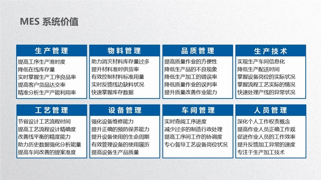 MES系统是面向制造企业车间执行层的生产信息化管理系统。MES可以为企业提供包括制造数据管理、计划排程管理、生产调度管理、库存管理、质量管理、人力资源管理、工作中心/设备管理、工具工装管理、采购管理、成本管理、项目看板管理、生产过程控制、底层数据集成分析、上层数据集成分解等管理模块,为企业打造一个扎实、可靠、全面、可行的制造协同管理平台。