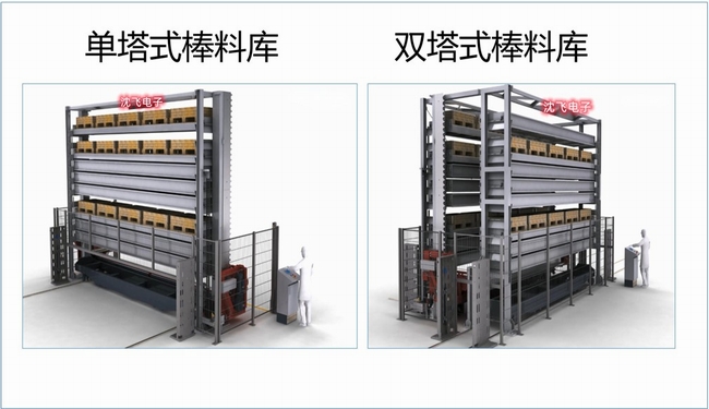 塔式棒料库分为单塔式棒料库和双塔式棒料库,由多层料架、自动上下料装置及控制系统组成。由主机控制,智能选取各层的原料,为生产过程提供优质和自动化的管理输送。塔式棒料库具备自动上料、下料双重功能。框架结构紧凑稳定,具备定位准确,运行快速灵活等特点。