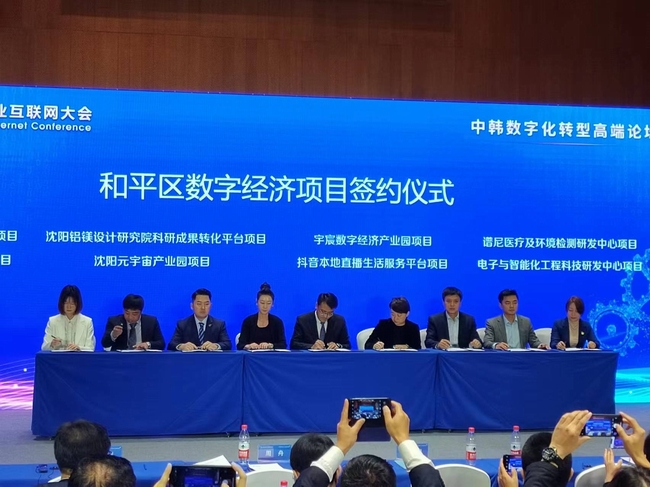 大会举办的和平区数字经济项目签约仪式上,和平区政府与沈阳沈飞电子科技发展有限公司,沈阳金数智能科技集团有限公司,辽宁省优展科技发展有限公司,沈阳铝镁设计研究院,上海融玉置业有限公司,中星网络科技(辽宁)有限公司,谱尼测试集团股份有限公司辽宁公司,辽海装饰工程有限责任公司成功签署战略合作协议。