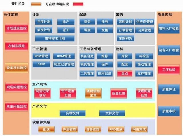 系统涵盖MES(制造执行系统组件)、WMS(库存管理组件)、SRM(供应商管理组件)、CRM(客户关系管理组件)、APC(高级排产组件)、APP(移动云组件),设备联网数据采集,真正实现了企业生产制程全智能化管理。